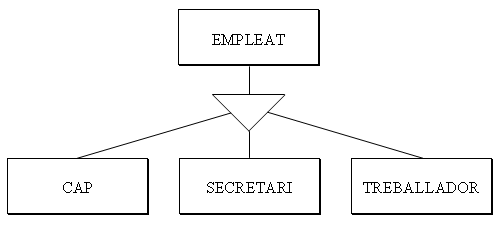 Empleat seria el SUPERTIPUS o SUPERCLASSE i els altres els SUBTIPUS. EMPLEAT seria la GENERALITZACIÓ dels altres. I els altres serien l'ESPECIALITZACIÓ d'EMPLEAT.