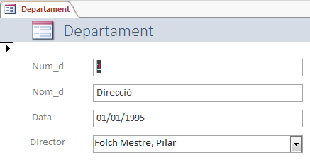 1.18) En el formulari Departament, llevar el quadre de text corresponent al Director, i inserir un quadre combinat (utilitzant l'assistent: "vareta màgica") per al camp director, de manera que es puga triar entre tots els empleats de l'empresa. Per a poder llegir millor és convenient que s'oculte la clau principal, encara que se seleccione de la taula Empleat tant el Dni com el Nom. Aquest podria ser l'aspecte: