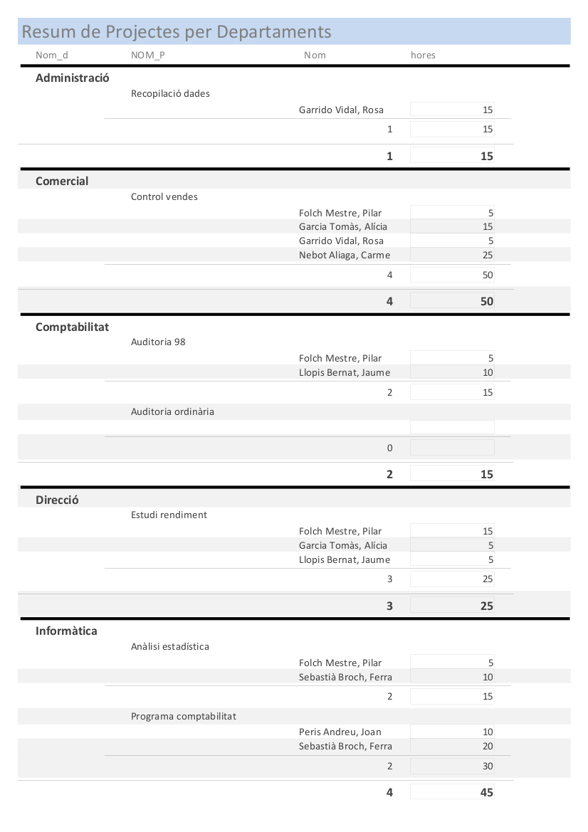 1.24 VOLUNTARI) Crear un informe com el que tens a continuació. Observa que el que tenim és: per cada Departament, veure els Projectes que coordina, i en cada projecte les persones que hi treballen. Tenim totals per cada projecte i cada Departament. El Departament d'Informàtica és molt il·lustratiu, perquè coordina 2 projectes.