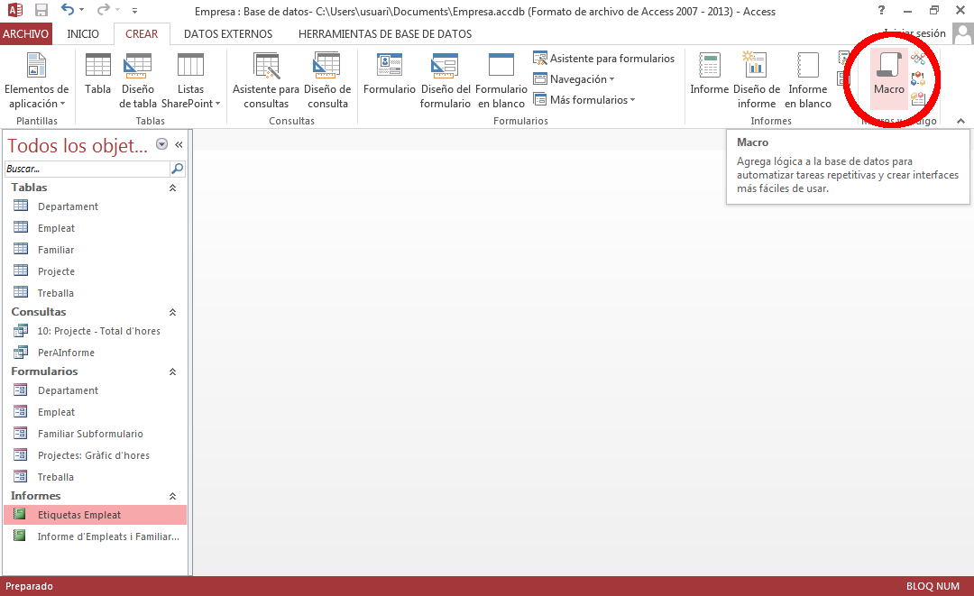 La manera inicial de crear una macro serà en la barra d'eines Crear a la dreta del tot, on hi ha un botó per a crear noves Macros o mòduls.