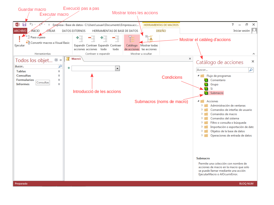 - si és una macro independent es pot fer des del Pannell d'exploració, apretant amb el botó de la dreta damunt de la macro i triant "Vista diseño", o si està associada a algun event d'un control d'un formulari, fent clic als tres puntets del costat.