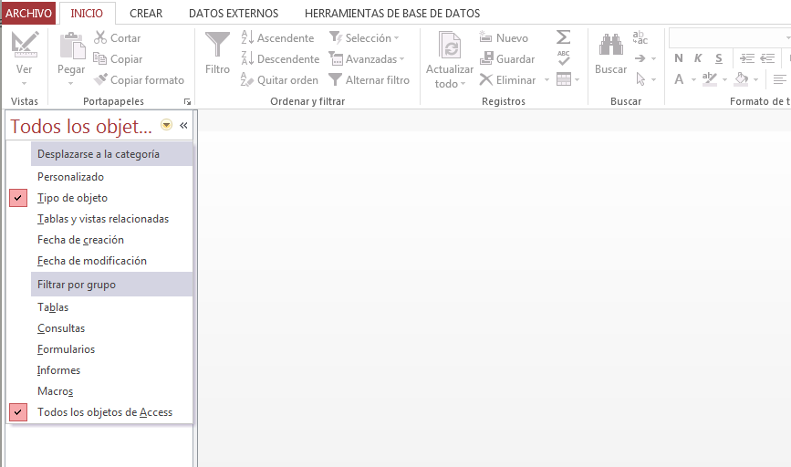 Ara ja podrem veure la macro a l'esquerra, en l'apartat de macros. Si no la veieu i esteu segurs que l'heu creada, segurament és perquè Access no està configurat en aquest moment per veure tots els objectes. Trieu l'opció Todos los objetos de Access del Pannell d'exploració (el que hi ha a l'esquerra), com us mostra la següent imatge: