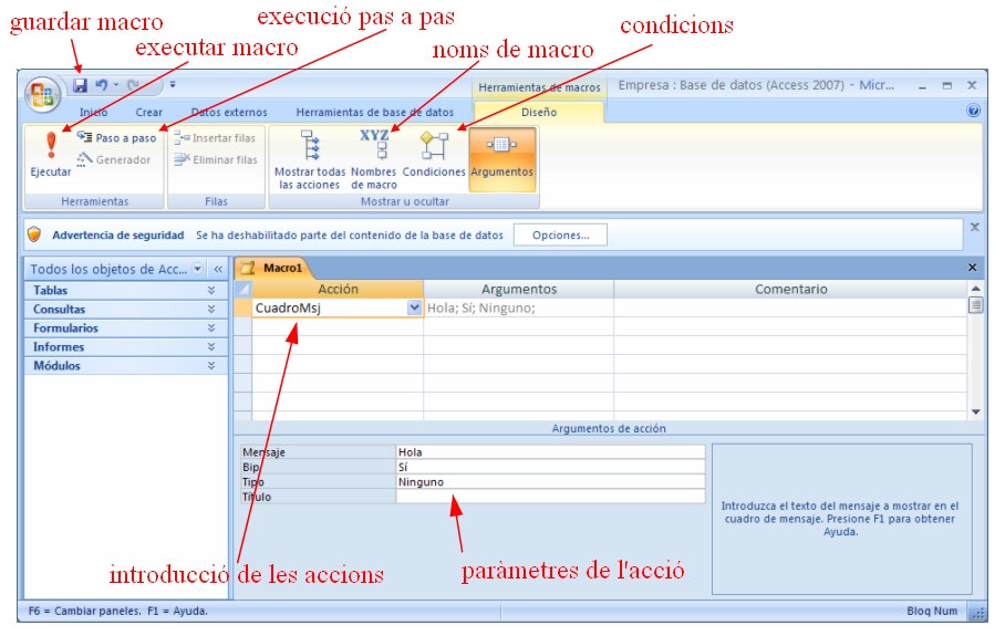 En la B.D. de l'empresa, feu la macro de la figura de dalt, però amb el títol "Missatge de salutació". Guardeu-la amb el nom "Salutació" i executeu-la.