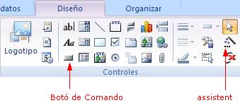 Creeu-vos un formulari nou, sense utilitzar cap assistent de manera que quede en blanc, sense res. S'aconsegueix anant al botó Diseño de formulario. Quan el guardeu li poseu el nom "Botons". Afegiu un botó de comando (mireu figura), però de moment sense utilitzar l'assistent ("vareta màgica" desactivada; mireu figura). El que volem és traure el missatge de salutació quan fem clic en el botó. Per aconseguir-ho, aneu a les propietats (botó dret sobre el botó, o tenint-lo seleccionat anar a Hoja de Propiedades) a la pestanya "eventos", sobre l'esdeveniment "al hacer clic" trieu la macro Salutació. Per acabar, canvieu el rètol Comando0 per Saludar. Ho podeu fer directament sobre el botó, o canviant la propietat "Titulo"