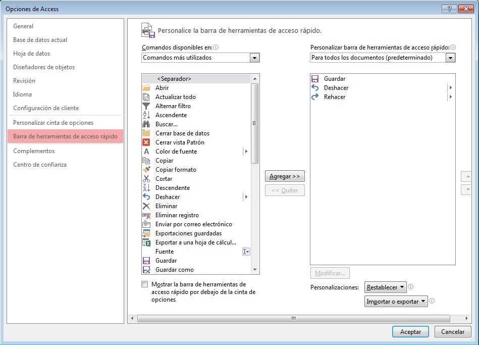 Per a configurar la barra d'accés ràpid, podem apretar a la fletxeta que es troba a la dreta de la mateixa barra per afegir les opcions més comunes o anar a Más comandos. Arribarem a la mateixa pantalla que si fem Archivo → Opciones → Barra de herramientas de acceso rápido.