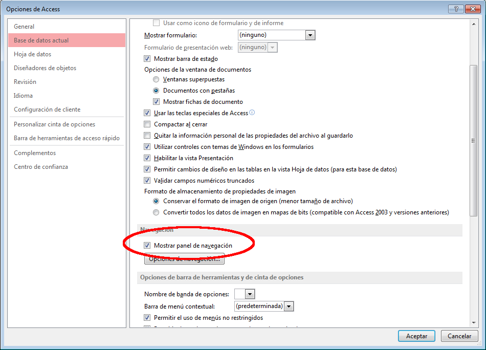 La primera aproximació seria ocultar el panell d'exploració. Es fa des de ARCHIVO → Opciones → Base de datos actual, com es pot observar en la següent figura.