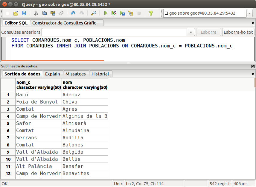 on estrictament el que estem fent és, del producte cartesià de les 2 taules, seleccionar únicament quan coincideix el nom_c (és a dir la comarca amb les seues poblacions), i per tant el resultat seria el mateix. Potser fóra més eficient utilitzar la primera manera, però de vegades la comoditat ens farà utilitzar la segona (sobretot quan s'hagen de combinar moltes taules).
