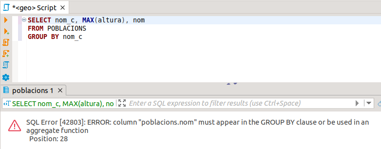Hem d'aprendre a identificar aquest error, i solucionar-lo. En aquest cas el solucionarem llevant el camp Nom. La sentència per a poder traure el nom de la població més alta de cada comarca és complicada, i encara no podem fer-la.