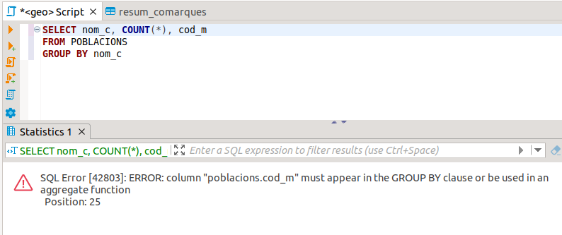 Per a solucionar-lo podem incloure el cod_m en el GROUP BY, i aleshores farem un grup per cada comarca i població diferent, però segurament això no ens valdrà de res en aquest exemple, perquè cada grup només contindrà un element (un municipi), encara que en altres exemples sí que pot tenir sentit. O si no era això el que preteníem, senzillament llevem el camp cod_m de la sentència, i ens funcionarà bé.