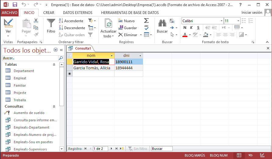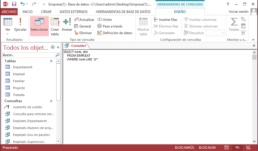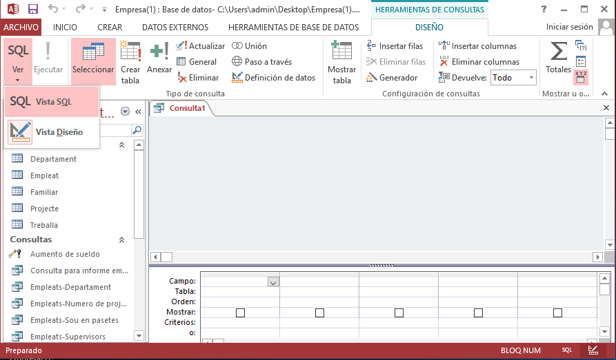 - De forma interactiva: s'escriu una sentència SQL, i s'executa, tornant normalment un conjunt de registres que es presentaran en forma tabular. En Access el lloc on procedir d'aquesta manera és en les consultes, triant Vista SQL. Tindrem lloc per escriure la sentència tal i com es mostra en la primera imatge. En la segona imatge, es mostra una consulta ja feta en el tema anterior, però veient-la en SQL. En la tercera hem executat la consulta:
