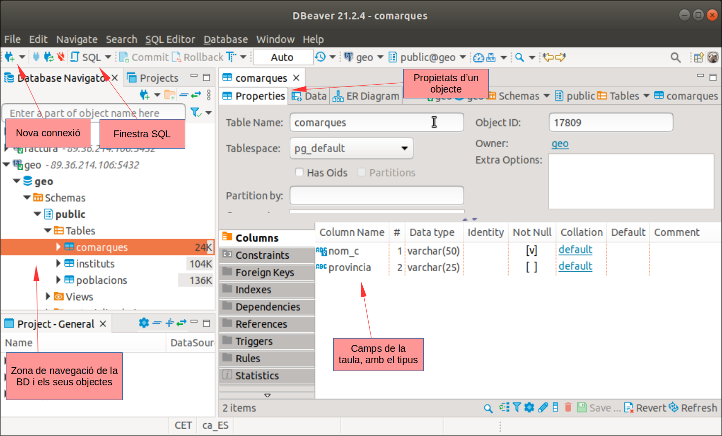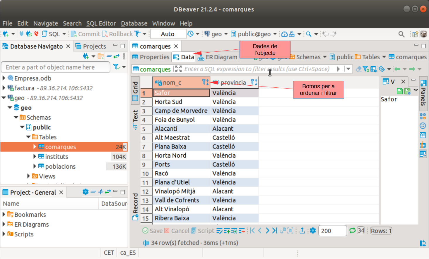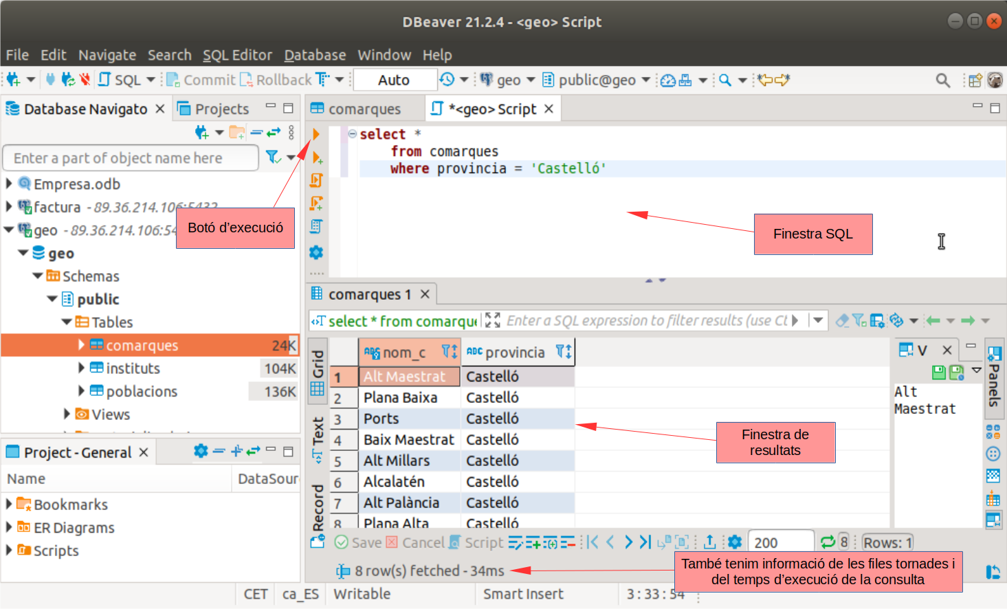 Una vegada feta la connexió, DBeaver ens permetrà navegar per les taules i altres objectes de la Base de Dades, inspeccionar les taules, i el més important per a nosaltres, executar sentències SQL de forma còmoda.