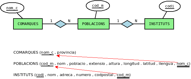 Tots els exemples que es mostraran en aquest tema s'intentaran fer sobre la connexió que ja tenim feta, és a dir, al servidor de l'Institut, connectant com a usuari geo (contresenya geo) a la Base de Dades geo. És una Base de Dades molt senzilleta, amb només 3 taules, cosa que ajudarà a una fàcil comprensió de la seua estructura. Aquest és l'esquema en el Model Entitat-Relació i en el Model Relacional: