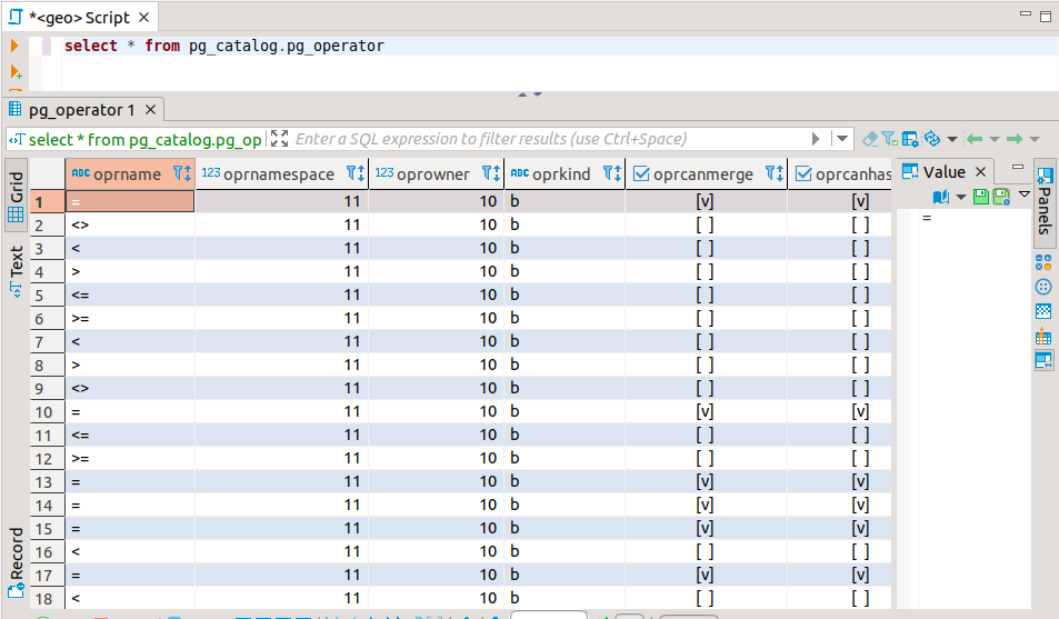 Es poden veure tots els operadors en la taula PG_OPERATOR, on tindrem el nom de l'operador, els tipus de dades dels operands i del resultat i el procediment que implementa l'operador. Ací tenim una vista d'aquesta taula, encara que hi ha tantíssims operadors que mareja i tot (els que estan repetits és per a especificar l'actuació sobre operands de diferents tipus).