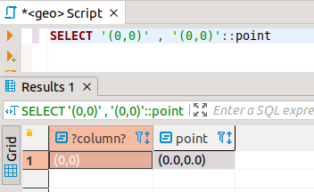 Per veure que realment hi ha un canvi ens aprofitem de DBeaver que diu de quin tipus és un camp, si pot. Observeu que en el primer camp no hem posat més que una tira de caràcters, però en el segon intentem reconvertir aquesta mateixa tira de caràcters al tipus POINT. En el resultat s'observa com ha entés que el tipus de la dada és POINT.
