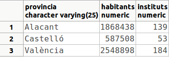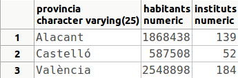 Podrem comprovar-ho, per exemple, introduint un nou registre. Abans de l'actualització, el contingut de la taula PROVINCIES és: