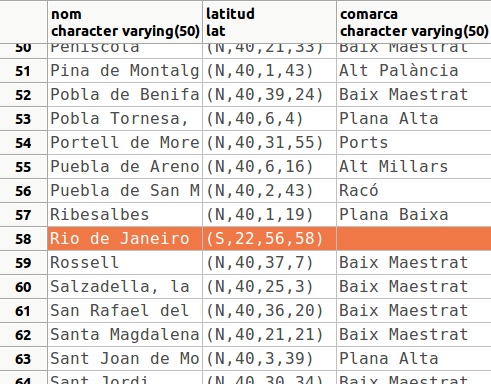 Per a demostrar que no funciona bé inserim una ciutat que estiga a l'hemisferi sud: Rio de Janeiro (ja havíem quedat que no importava si es deteriorava la Base de Dades).