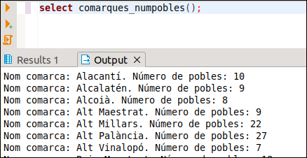7.7.- Fes una funció anomenada POBLACIONS_ALTES que accepte 2 paràmetres, el primer de tipus text que serà una comarca, i el segon numèric que serà una altura. Ha de traure les poblacions de la comarca del primer paràmetre que són més altes que el segon paràmetre. Mostrarem el nom de la població i l'altura. Aquest podria ser el resultat en executar-se: