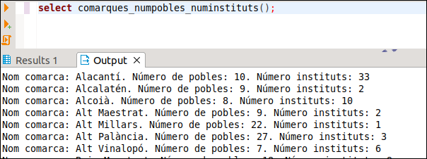 7.9.- Fes una funció anomenada COMARQUES_NUMPOBLES_NUMINSTITUTS sense paràmetres que traga per pantalla les comarques ordenades alfabèticament amb el número de pobles de cadascuna i el número d'instituts. En la consulta tindrem dos dificultats: