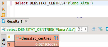 7.18.- VOLUNTARI. Fes una funció en PL/pgSQL anomenada DENSITAT_CENTRES que donat el nom d'una comarca ens torne la quantitat de centres que té per unitat de superfície.