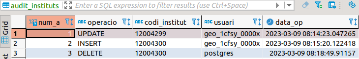 podríem pensar que sempre serà el mateix usuari qui fa l’operació, però en realitat ho pot fer tot usuari que tinga permís d’accés a la Base de Dades. En la imatge es pot observar com l’usuari postgres també ha fet una operació d’actualització - data_op: data-hora (timestamp) de l’actualització; es pot obtenir amb la funció now()